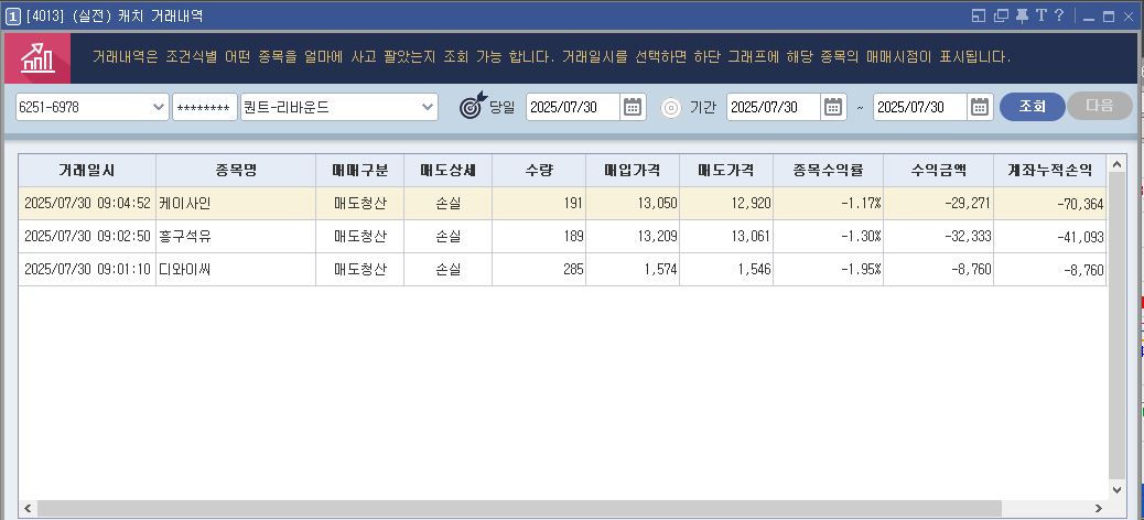오늘의 마지막 매매인 케이사인마저 앞선 두 종목과 완전히 동일한 패턴으로 손실을 기록했습니다. 이로써 명확해졌습니다. 제 '퀀트-리바운드' 전략은 지금, 장 초반의 변동성을 기회가 아닌 독으로 받아들이고 있습니다.