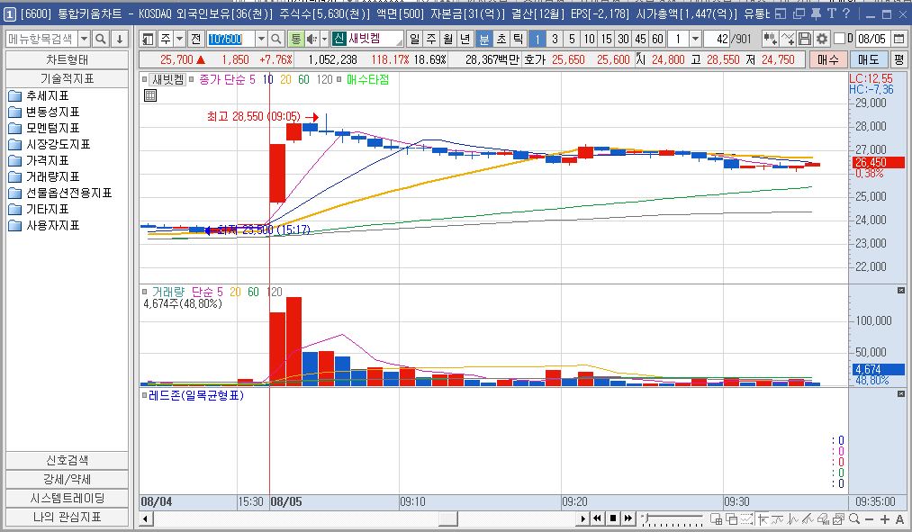 이미 강력한 일봉 상승 추세 위에서, 장 초반 변동성이 폭발하며 볼린저밴드 상단을 뚫어버렸습니다.