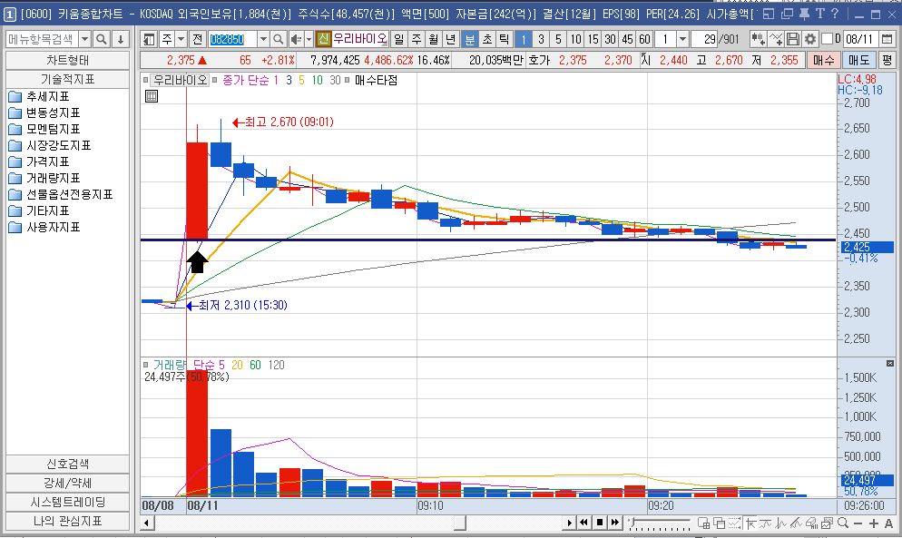 우리바이오 1분봉 차트