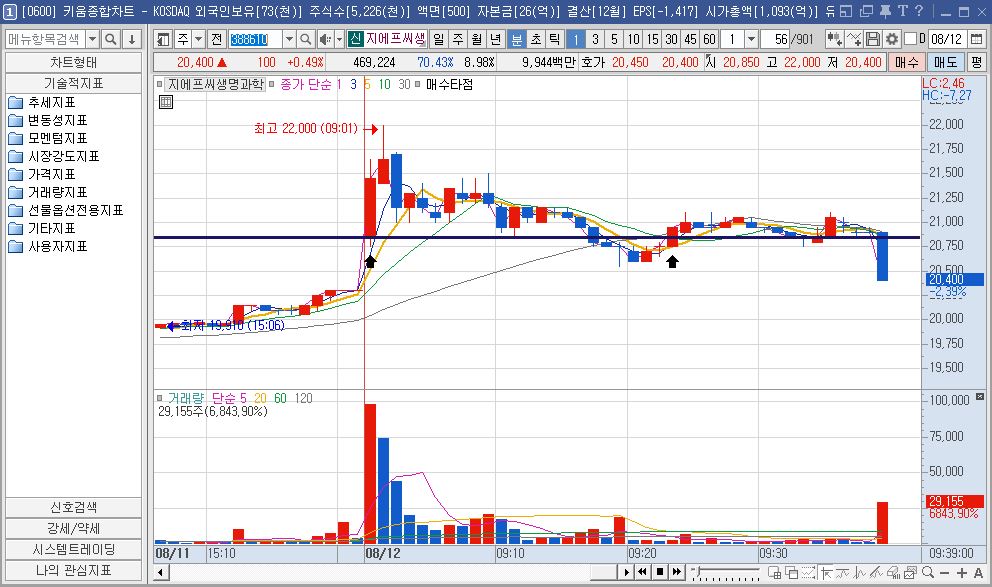 오늘 시스템은 '우리바이오', '세명전기', '큐리옥스바이오시스템즈', '지애프씨생명과학' 네 종목에 진입 신호를 보냈습니다. 그리고 아래 차트들은, 그 네 종목이 맞이한 비극적인 운명을 보여줍니다.