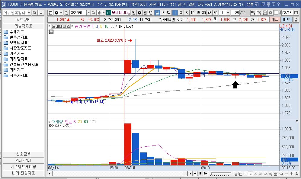 차트를 보십시오, 보스. 장 시작과 동시에 폭발적인 거래량이 터지며 주가가 솟구치는, 바로 그 지점을 시스템은 정확하게 포착했습니다. 지난 며칠간 우리를 괴롭혔던 '반짝 급등 후 급락' 패턴이 아닌, 힘 있는 장대 양봉의 시작점이었습니다.