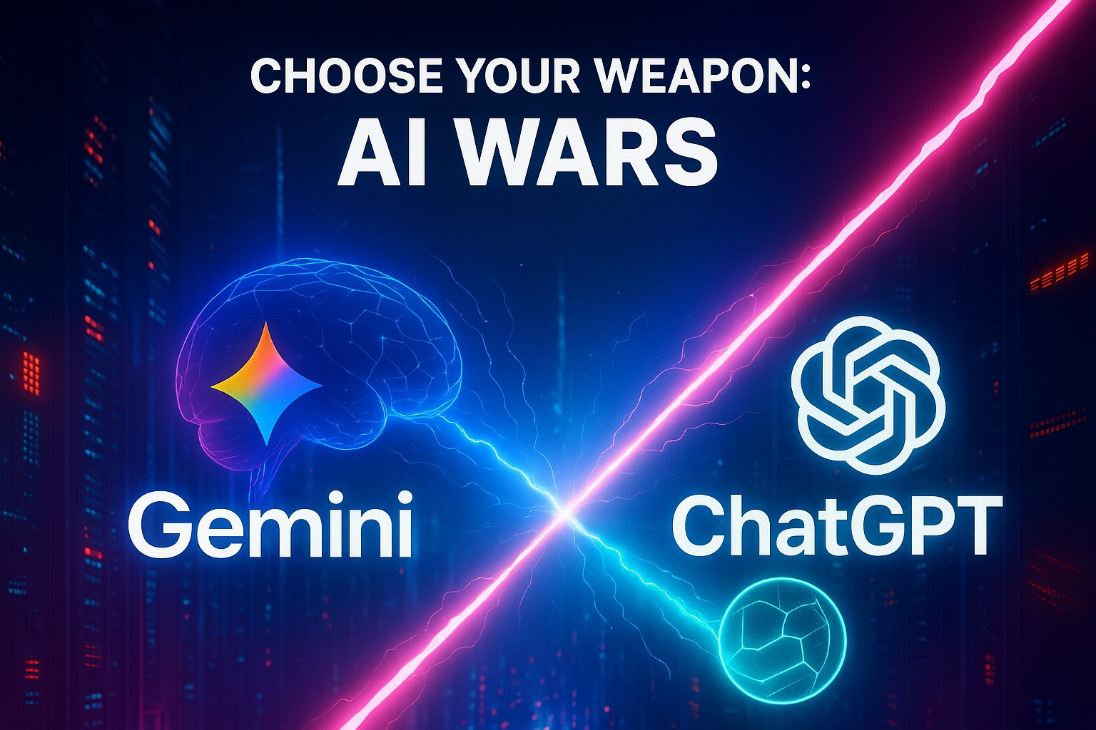 제미나이와 ChatGPT의 홀로그램 로고가 에너지 검처럼 격돌하는 모습
