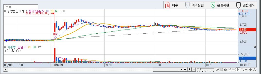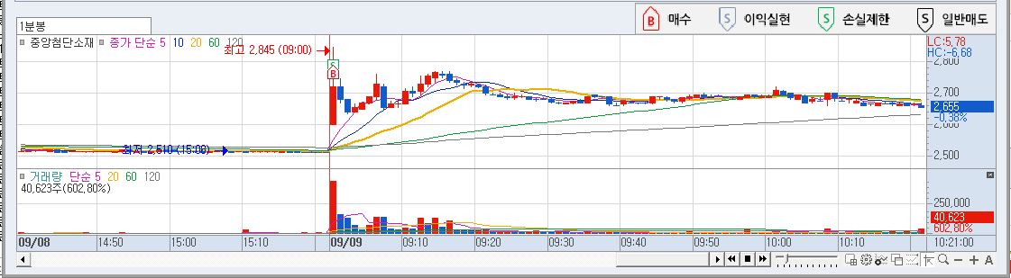 오늘 실전과 모의에서 공통적으로 매매한 중앙첨단소재의 경우를 보면, 새로운 조건식의 약점이 명확히 드러납니다.