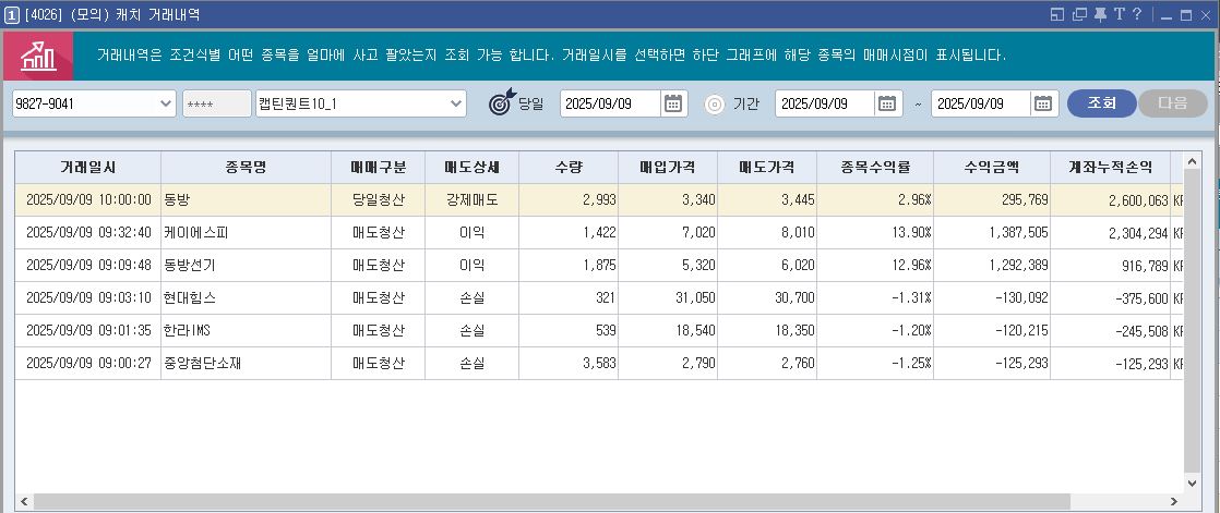 - 동방 (+2.35%): 마찬가지로 장 초반의 강한 힘을 이용해 짧게 수익을 끊어내는 데 성공했습니다. 리스크 관리에 충실한, 전형적인 시스템 트레이딩의 모습을 보여주었습니다.