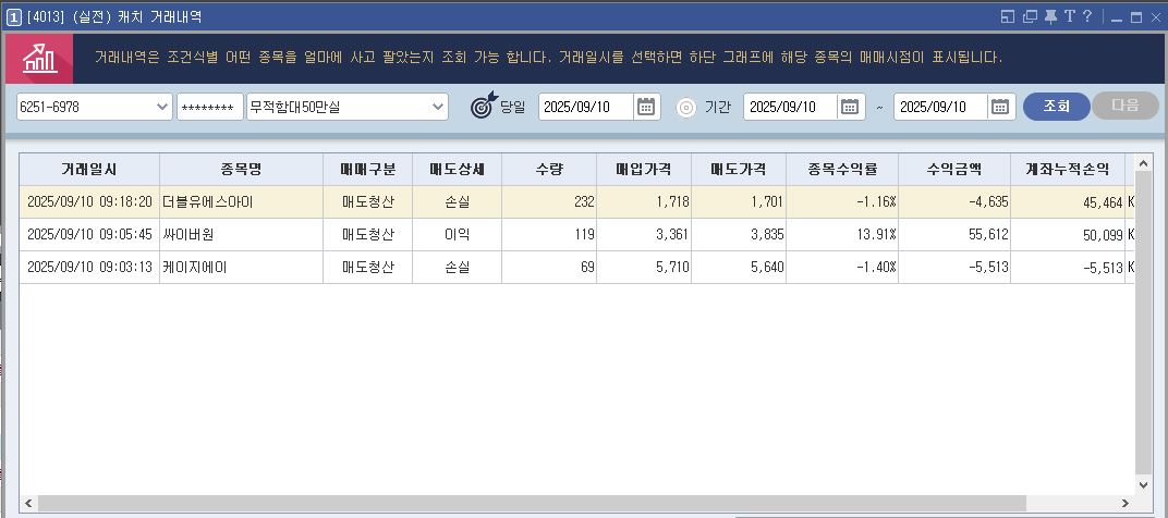 조건식은 다시 한 번 급등 초반 14% 구간을 정확히 포착했고, 싸이버원에서의 익절로 계좌는 플러스 마감했습니다.